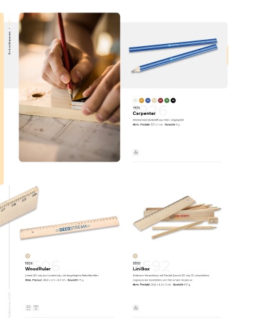 Lineal (30 cm) aus Lindenholz, mit eingelegtem Metallstreifen. Hölzerne Verwahrbox mit Deckel (Lineal 20 cm), 12 unlackierten,