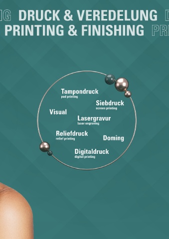 Tampondruck pad printing Siebdruck Visual screen printing Lasergravur laser engraving Reliefdruck relief printing Doming Digitaldruck digital printing