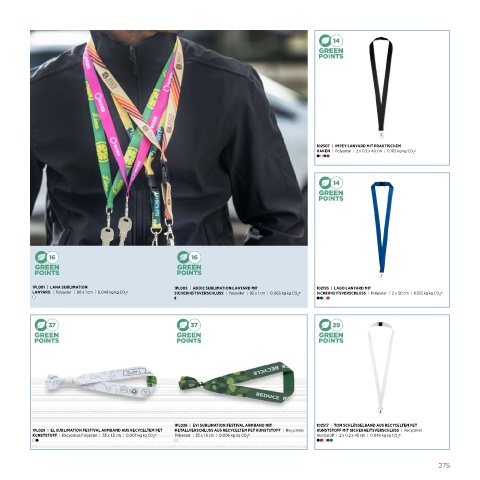 LANYARD | Polyester | 90 x 1 cm | 0.049 kg kg CO 2 e SICHERHEITSVERSCHLUSS | Polyester | 93 x 1 cm | 0.063 kg kg CO 2 e SICHERHEITSVERSCHLUSS | Polyester | 2 x 50 cm | 0.133 kg kg CO 2 e