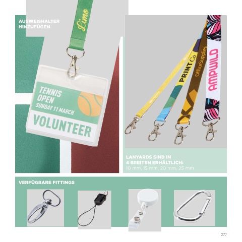 AUSWEISHALTER HINZUFÜGEN LANYARDS SIND IN 4 BREITEN ERHÄLTLICH: 10 mm, 15 mm, 20 mm, 25 mm VERFÜGBARE FITTINGS 277