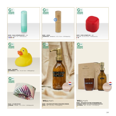 Kunststoff | Ø 1.8 x 7 cm | 0.056 kg kg CO 2 e LIPPENPFLEGE | Bambusholz | Ø 2.1 x 7.6 cm | 0.030 kg kg CO 2 e Kunststoff | 3.5 x 3.5 x 3.5 cm | 0.080 kg kg CO 2 e