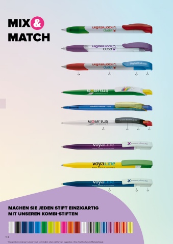 MACHEN SIE JEDEN STIFT EINZIGARTIG MIT UNSEREN KOMBI-STIFTEN 140 *Preise in Euro, inklusive 1-farbiger Druck an 1 Position, sofern nicht anders angegeben. Ohne Frachtkosten und Mehrwertsteuer.