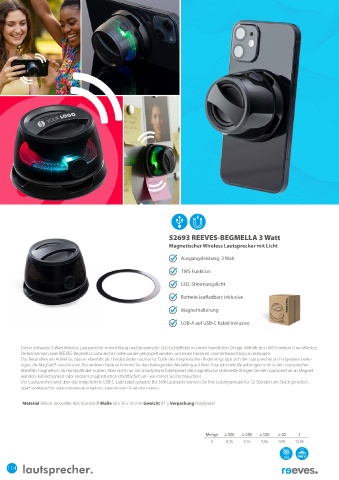 Das Besondere am Artikel ist, dass er ebenfalls als Handyständer nutzbar ist. Dank des magnetischen Bodenrings lässt sich der Lautsprecher an Endgeräten befes-