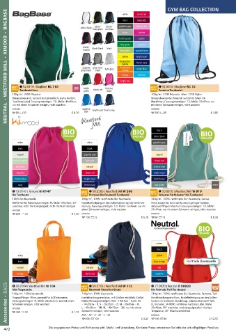 Accessories • BAGS a 400 b 50 € 1,70 140g/m², 100% Baumwolle 210g/m², 100% zertifizierte Bio-Baumwolle, Fairtrade, Twill