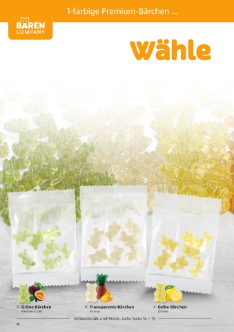 1-farbige Premium-Bärchen ... Wähle A Grüne Bärchen B Transparente Bärchen C Gelbe Bärchen Passionsfrucht Ananas Zitrone Artikeldetails und Preise, siehe Seite 14 – 15 12