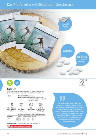 13 x 10 mm, mit Eisbonbon-Geschmack, im Werbetütchen verpackt.