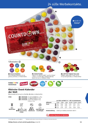 u 24 bunte Schokolinsen v 24 Pulmoll Pastillen w 24 SKITTLES® Original Fruity Candy