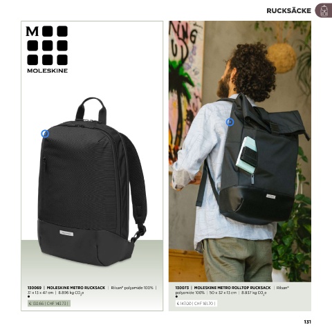 130069 | MOLESKINE METRO RUCKSACK | Rilsan® polyamide 100% | 130073 | MOLESKINE METRO ROLLTOP RUCKSACK | Rilsan®