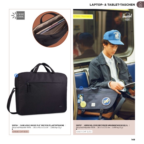 120724 | CASE LOGIC INVIGO 15,6” RECYCELTE LAPTOPTASCHE | 120757 | HERSCHEL COVE RECYCELTE UMHÄNGETASCHE 22,5 L |