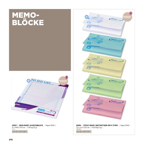 MEMO- BLÖCKE 21203 | DESK-MATE® A5 NOTIZBLOCK | Paper 100% | 21094 | STICKY-MATE® HAFTNOTIZEN 100 X 75 MM | Paper 100% | 21 x 14.8 x 0.6 cm | 0.111 kg CO e 7.5 x 10 x 0.25 cm | 0.031 kg CO e 2 2 € 0.76 | CHF 0.84 | € 0.46 | CHF 0.51 | 210