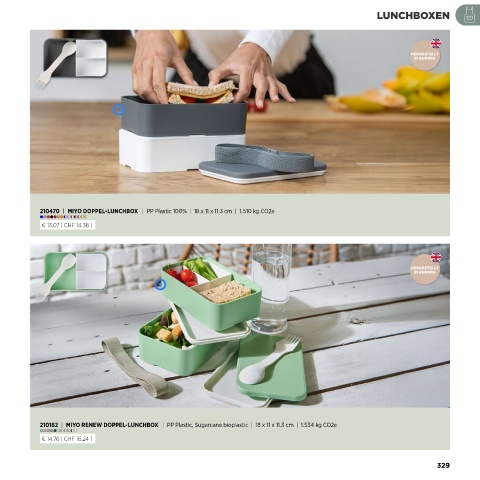 LUNCHBOXEN 210470 | MIYO DOPPEL-LUNCHBOX | PP Plastic 100% | 18 x 11 x 11.3 cm | 1.510 kg CO2e € 13.07 | CHF 14.38 | 210182 | MIYO RENEW DOPPEL-LUNCHBOX | PP Plastic, Sugarcane bioplastic | 18 x 11 x 11.3 cm | 1.534 kg CO2e € 14.76 | CHF 16.24 | 329