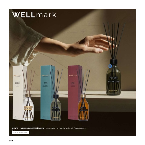 126409 | WELLMARK DUFTSTÄBCHEN | Glass 100% | 6.2 x 6.2 x 30.2 cm | 0.660 kg CO2e € 27.23 | CHF 29.95 | 358