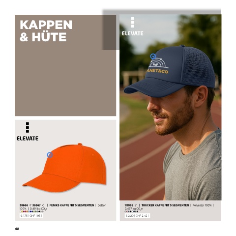 KAPPEN & HÜTE 38666 38667 k | FENIKS KAPPE MIT 5 SEGMENTEN | Cotton 111069 | TRUCKER KAPPE MIT 5 SEGMENTEN | Polyester 100% | k 100% | 0.491 kg CO e 0.497 kg CO e 2 2 € 1.75 | CHF 1.93 | € 2.20 | CHF 2.42 | 48