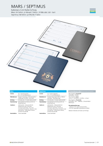 Kalendarium Deutsch 1sprachig · je Monat 2 Seiten · Kalendarium Deutsch 3sprachig D/GB/F · je Woche Mars/Septimus Salsa