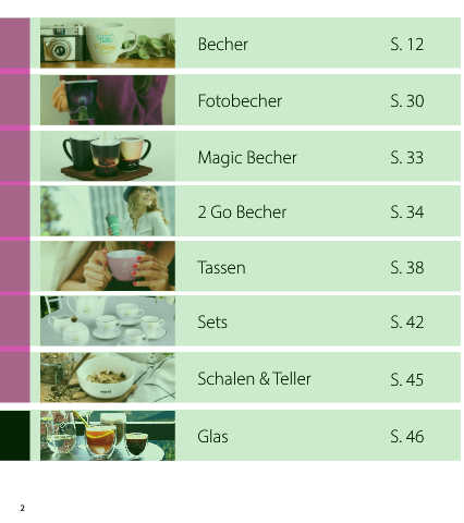 Becher S. 12 Fotobecher S. 30 Magic Becher S. 33 2 Go Becher S. 34 Tassen S. 38 Sets S. 42 Schalen & Teller S. 45 Glas S. 46 2