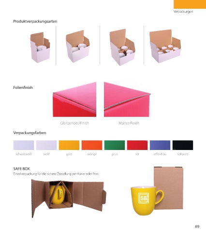 Verpackungen Produktverpackungsarten Folienfinish Glänzendes Finish Mattes Finish Verpackungsfarben schneeweiß weiß gelb orange grün rot reflexblau schwarz SAFE BOX Einzelverpackung für die sichere Zustellung per Kurier oder Post. 69