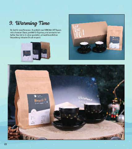 9. Warming Time Ein Set für zwei Personen. Es enthält zwei VERONA SET-Tassen mit schwarzer Glasur, perfekt für Espresso, und aromatischen Kaffee. Das Set ist in einer speziellen, umweltfreundlichen Verpackung inklusive Druck verpackt. 22 22