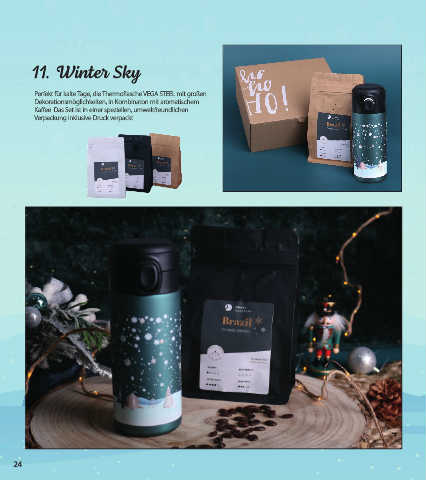 packshot 11. Winter Sky Perfekt für kalte Tage, die Thermoflasche VEGA STEEL mit großen Dekorationsmöglichkeiten, in Kombinaton mit aromatischem Kaffee. Das Set ist in einer speziellen, umweltfreundlichen Verpackung inklusive Druck verpackt. 24 24
