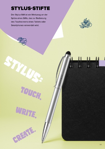 STYLUS-STIFTE Der Stylus-Stift ist ein Werkzeug an der Spitze eines Stifts, das zur Bedienung des Touchscreens eines Tablets oder Smartphones verwendet wird. STYLUS: TOUCH, WRITE, CREATE. 177
