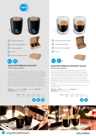 gen Espressobechern aus recyceltem Edelstahl. Die elegant geschwunge- silikatglas, jeweils mit einem Füllvolumen von 55 ml. Das hochwertige