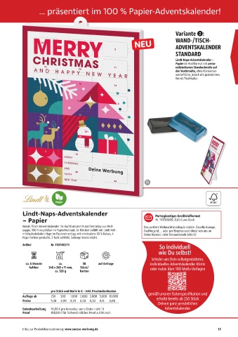 pappe, 100 % recyclebar im Papierkreislauf, 24 Türchen befüllt mit Lindt-Voll- flachliegend, … oder per Einzelversand direkt von uns an