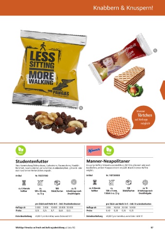 blanchiert, Haselnusskerne) und Sultaninen, in alubedampftem, glänzend- oder kaschiertem, weißem Flowpack einzeln verpackt. Bruch einzelner Waffeln