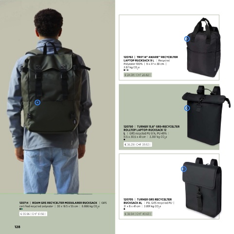 certified recycled polyester | 30 x 18.5 x 55 cm | 6.886 kg CO e 31 x 8 x 41 cm | 3.891 kg CO e