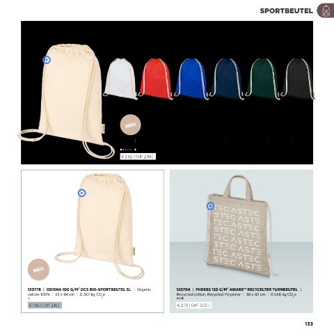 120778 | ODISHA 100 G/M² OCS BIO-SPORTBEUTEL 5L | Organic 120704 | PHEEBS 150 G/M² AWARE™ RECYCELTER TURNBEUTEL |