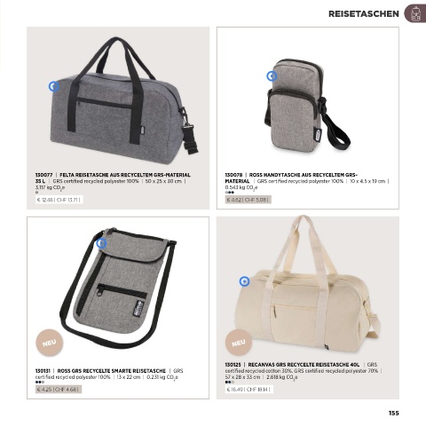 130077 | FELTA REISETASCHE AUS RECYCELTEM GRS-MATERIAL 130078 | ROSS HANDYTASCHE AUS RECYCELTEM GRS-