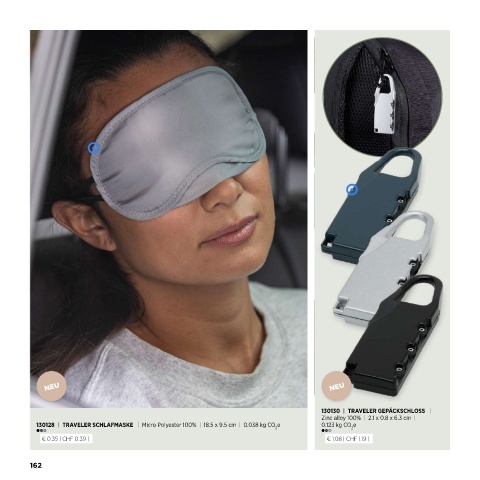130130 | TRAVELER GEPÄCKSCHLOSS | Zinc alloy 100% | 2.1 x 0.8 x 6.3 cm | 130128 | TRAVELER SCHLAFMASKE | Micro Polyester 100% | 18.5 x 9.5 cm | 0.038 kg CO e 0.123 kg CO e 2 2 € 0.35 | CHF 0.39 | € 1.08 | CHF 1.19 | 162