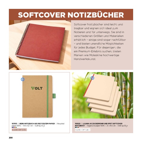 paper 100% | 17.8 x 12.7 cm | 0.26 kg CO e NOTIZBUCH | Sugarcane paper 100% | 21 x 14.5 cm | 0.66 kg CO e
