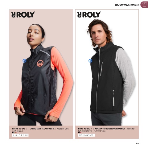 BODYWARMER R6684 XS- 2XL | JANNU LEICHTE LAUFWESTE | Polyester 100% | R1199 XS-2XL | NEVADA SOFTSHELLBODYWARMER | Polyester 3.174 kg CO e 92%, Elastane 8% | 4.394 kg CO e 2 2 € 9.41 | CHF 10.35 | € 16.91 | CHF 18.60 | 45