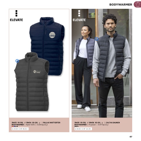 BODYWARMER 39433 XS-3XL m 39434 XS-2XL f | PALLAS WATTIERTER 39435 XS-3XL m 39436 XS-2XL f | CALTHA DAUNEN m f f m BODYWARMER | Nylon 100% | 4.544 kg CO e BODYWARMER | Polyester | 4.477 kg CO e 2 2 € 43.91 | CHF 48.30 | € 94.83 | CHF 104.31 | 47