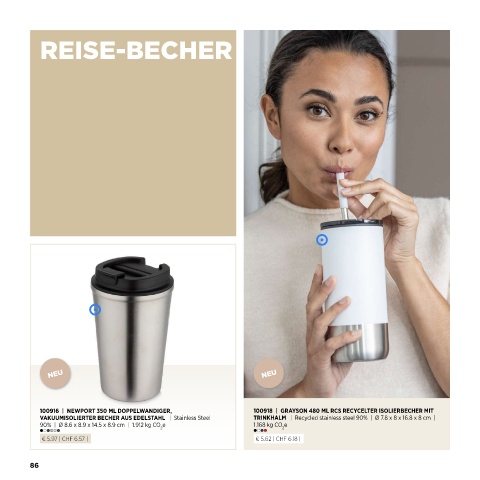 100916 | NEWPORT 350 ML DOPPELWANDIGER, 100918 | GRAYSON 480 ML RCS RECYCELTER ISOLIERBECHER MIT
